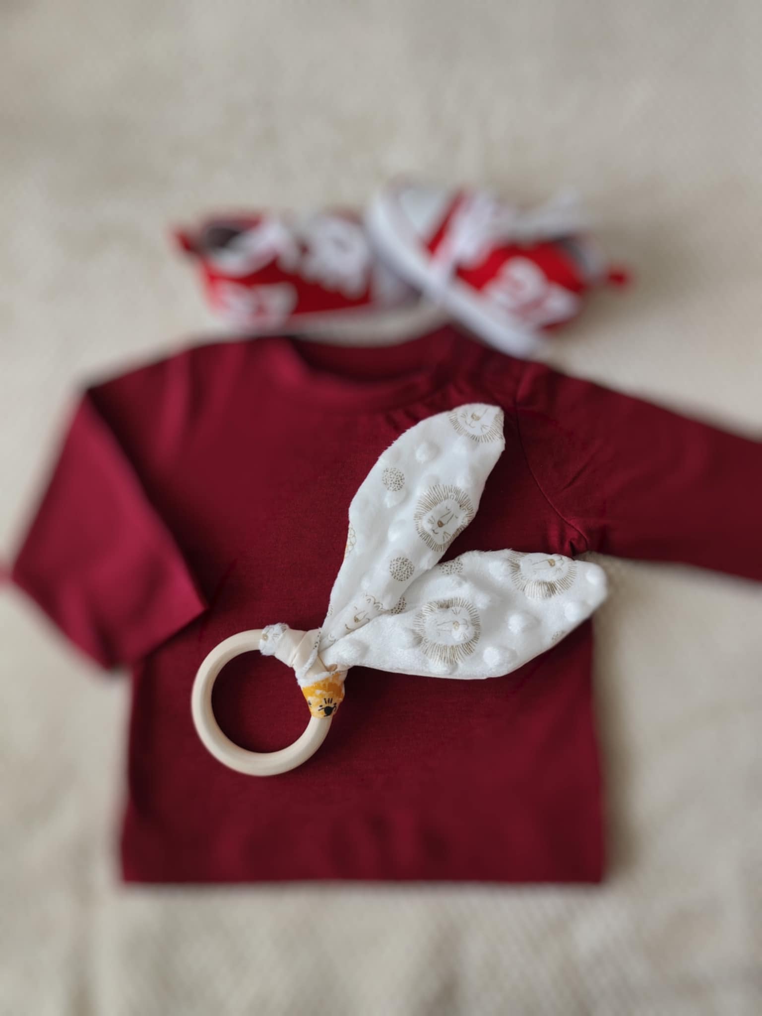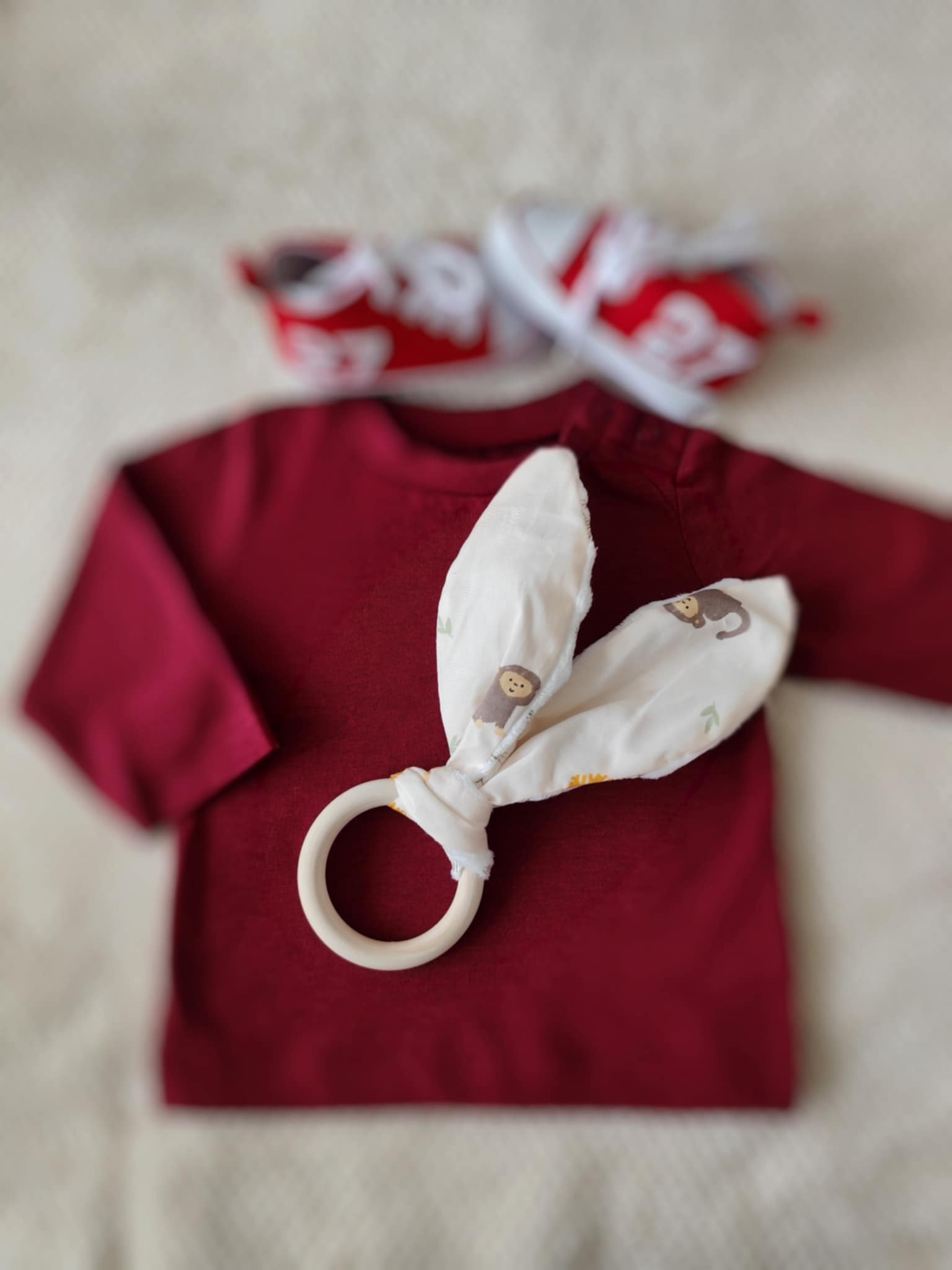 Composition : anneau en bois naturel. Tissu coton et Minky