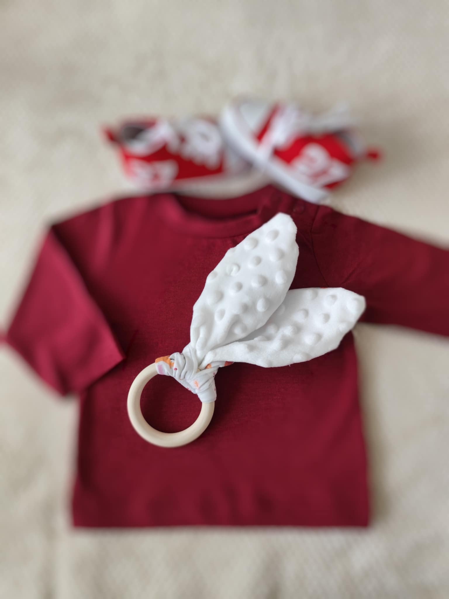 Cet anneau de dentition en bois naturel, avec de jolies oreilles en tissu, est conçu pour offrir un soulagement aux bébés pendant la poussée dentaire. Sa petite taille et sa légèreté en font un accessoire parfait pour les tout-petits.
