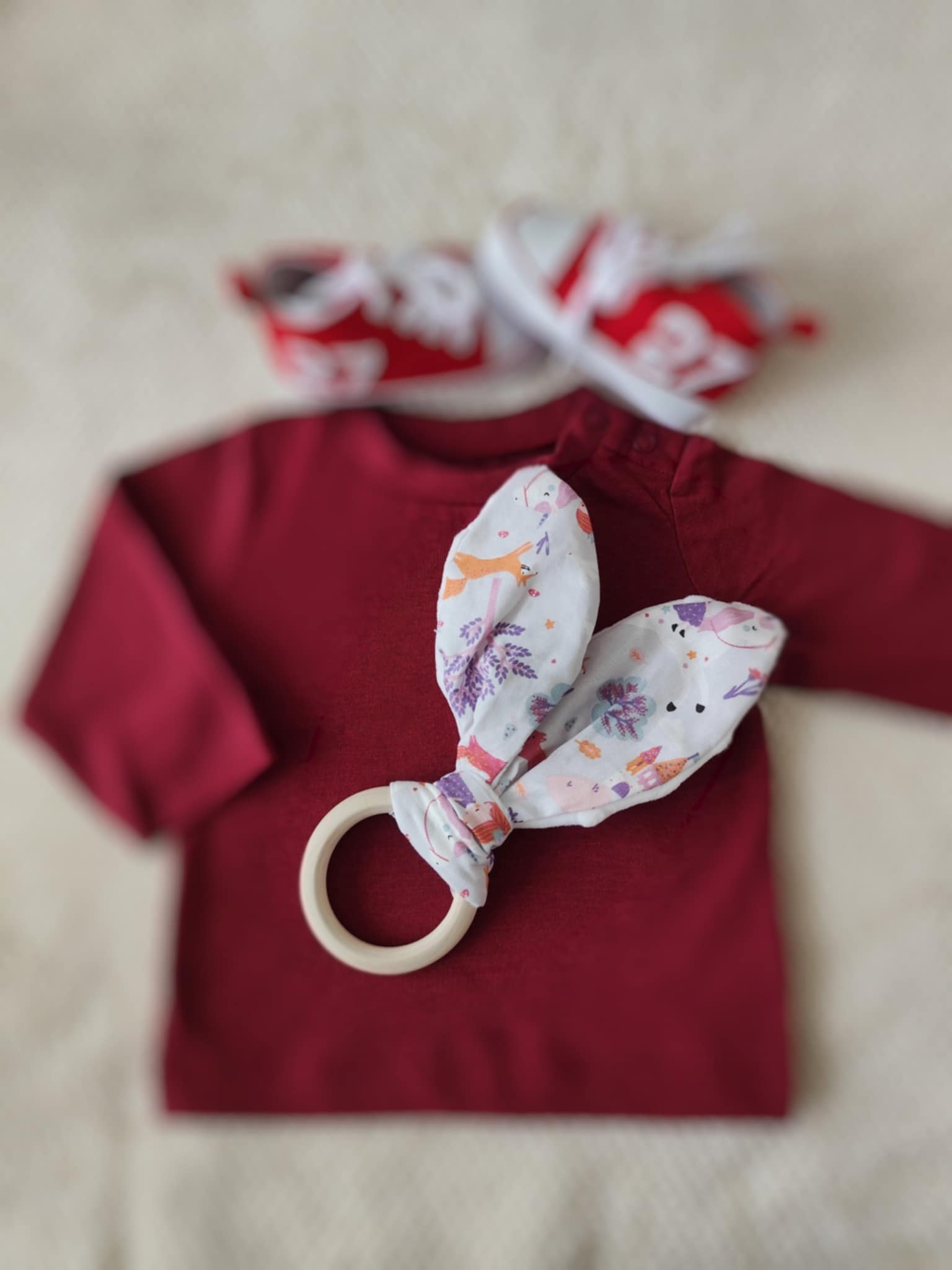 Composition : anneau en bois naturel. Tissu coton et Minky