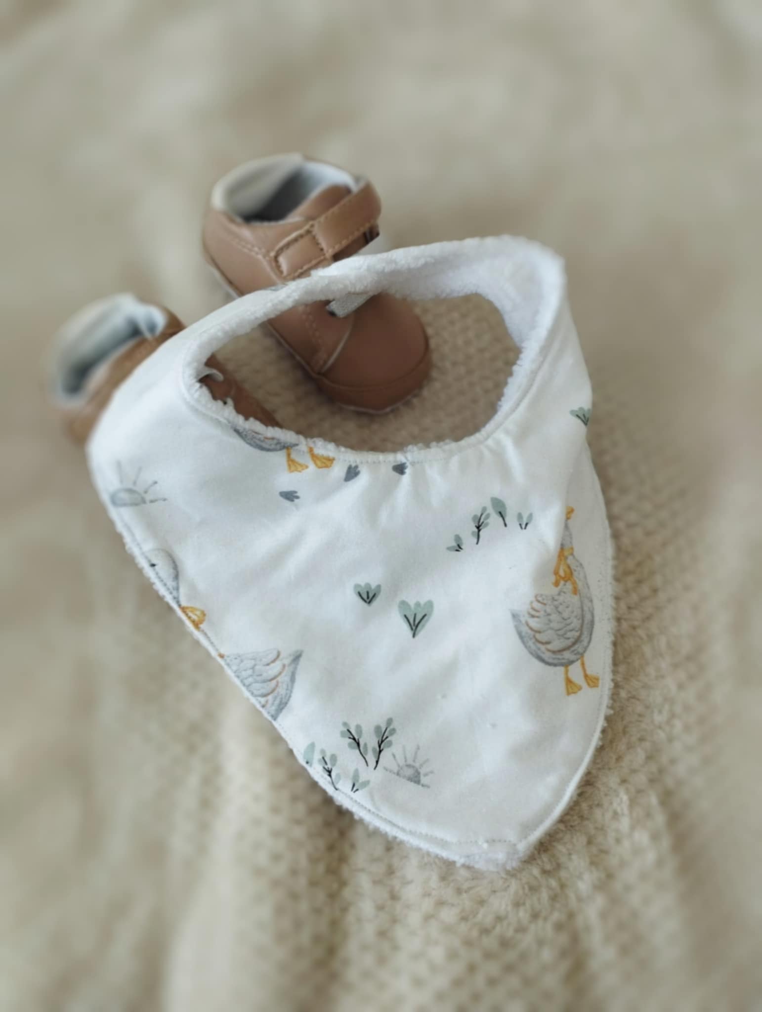 Bavoir naissance cousu main. En coton et éponge bambou avec pression. De petite taille, ce bavoir sera votre allié pour les repas de vos enfants.