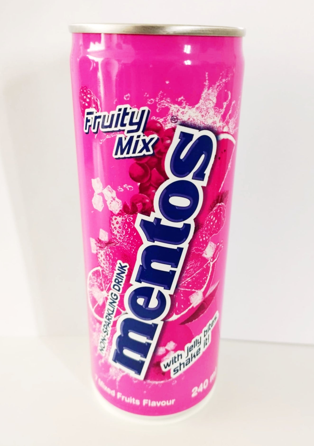 Canette de 240ml de Mentos Fruity Mix, les bonbons à la menthe les plus célèbres deviennent une boisson gazeuse unique en son genre. Cette incroyable boisson signée Mentos combine la saveur fruitée des bonbons à la menthe classiques avec des morceaux gélatineux de gelée de coco. Le résultat est une saveur douce et rafraîchissante qui vous apportera du soulagement lors des journées chaudes, et pas seulement.