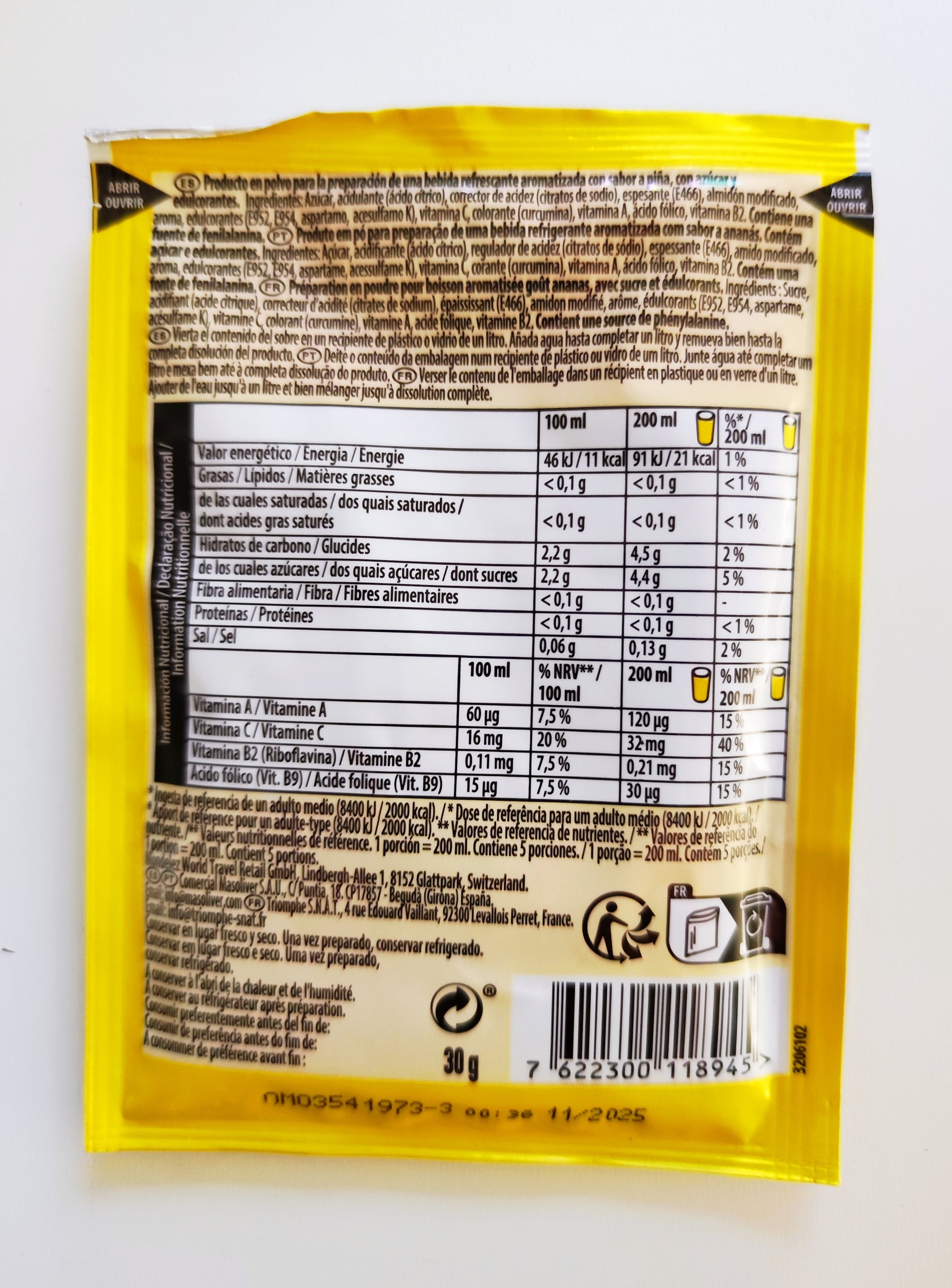 Ingrédients : Sucre, acidifiant (acide citrique), correcteur d'acidité (citrate de sodium),épaississant (E 466), amidon modifié, arôme, édulcorant (E952, E954, aspartame, acésulfame K), vitamine C, colorant (curcumine), vitamine A, acide folique, vitamine B2. contient une source de phénylalanine.