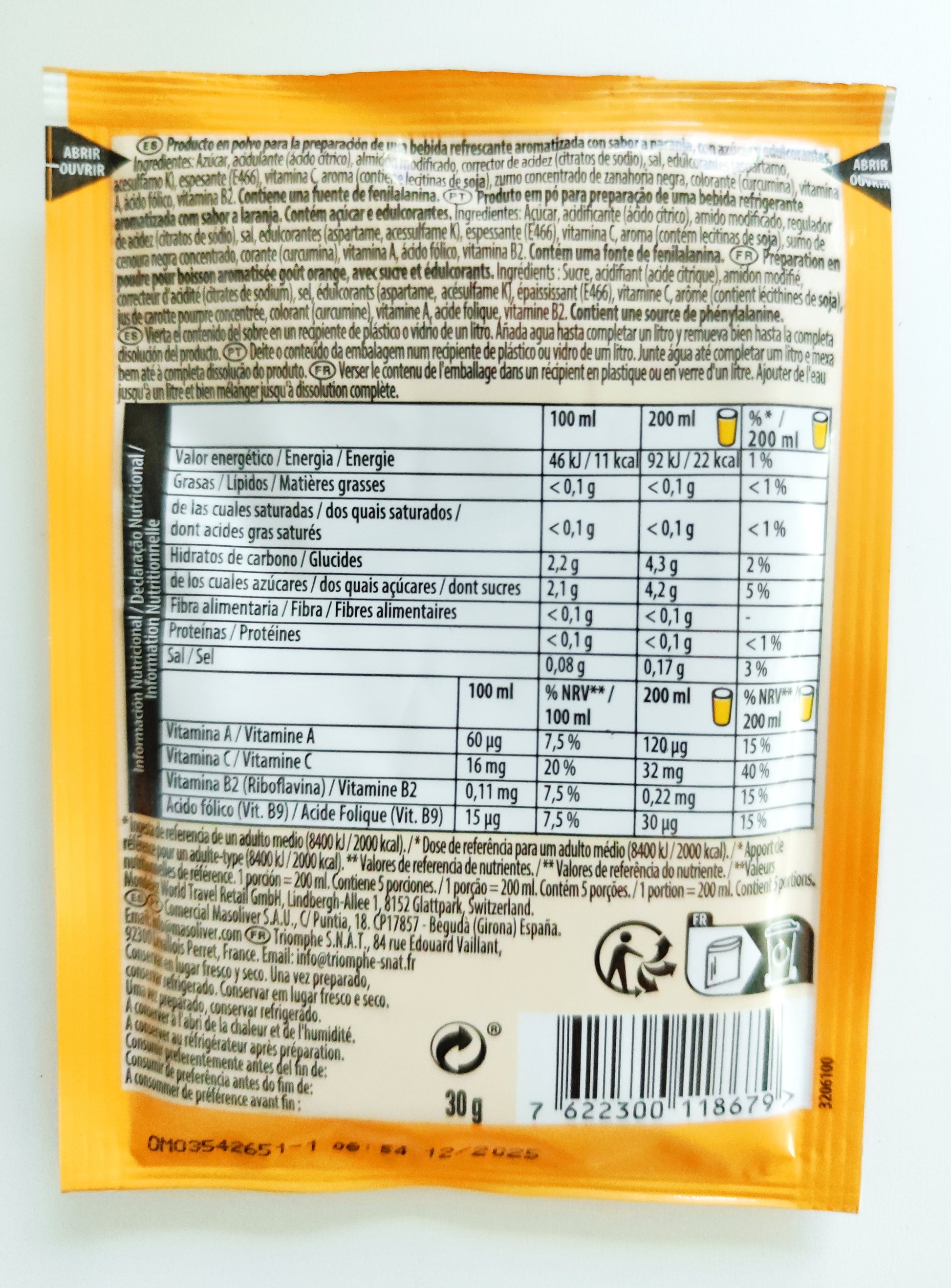 Ingrédients : Sucre, acidifiant (acide citrique), amidon modifié, correcteur d'acidité (citrates de sodium), sel, édulcorants (aspartame, acésulfame K), épaississants (E466), Vitamine C, arôme (contient lécithines de SOJA), jus de carotte pourpre concentrée, colorant (curcumine), vitamine A, acide folique, vitamine B2. Contient une source de phénylalanine.