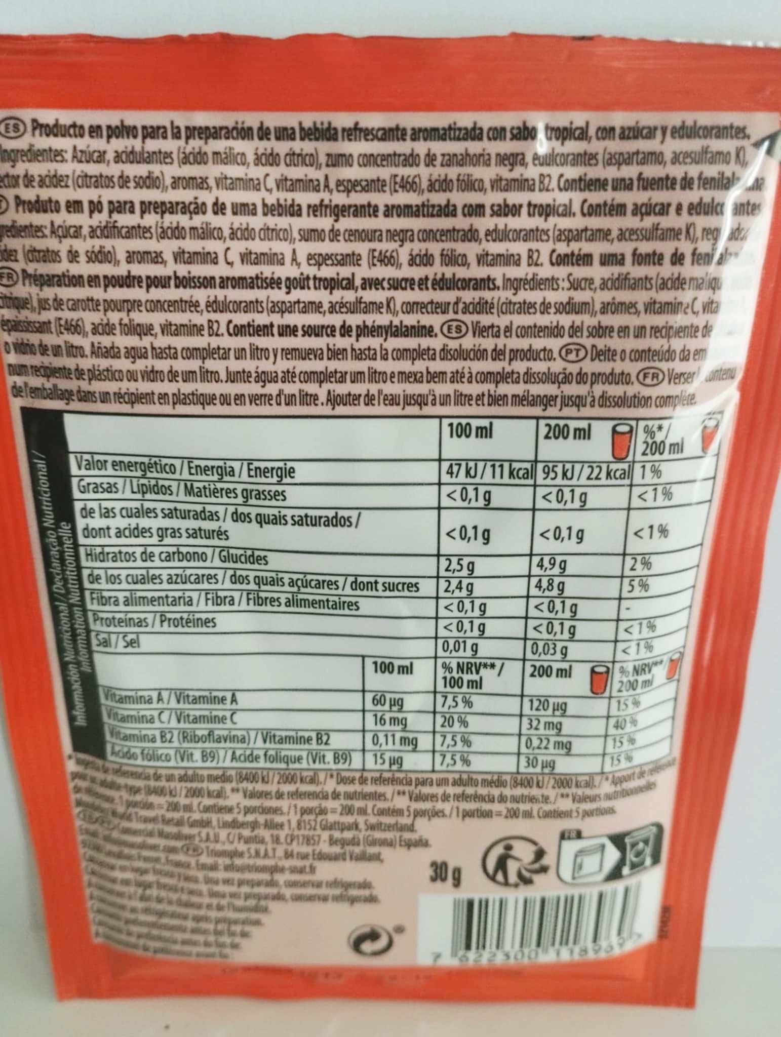Ingrédients : Sucre, acidifiant (E-296, acide citrique), édulcorant (aspartame, acésulfame-K), régulateur d’acidité (E_331), arômes, vitamine C ,colorants (E-120, E100), jus d’orange déshydraté (0,3%), jus de fraise déshydraté (0,2%), maltodextose, épaississant (E-466), pulpe de mangue déshydraté (0,1%),béta carotène, acétate de vitamine A, acide folique, vitamine B2, contient une source de phénylalanine.