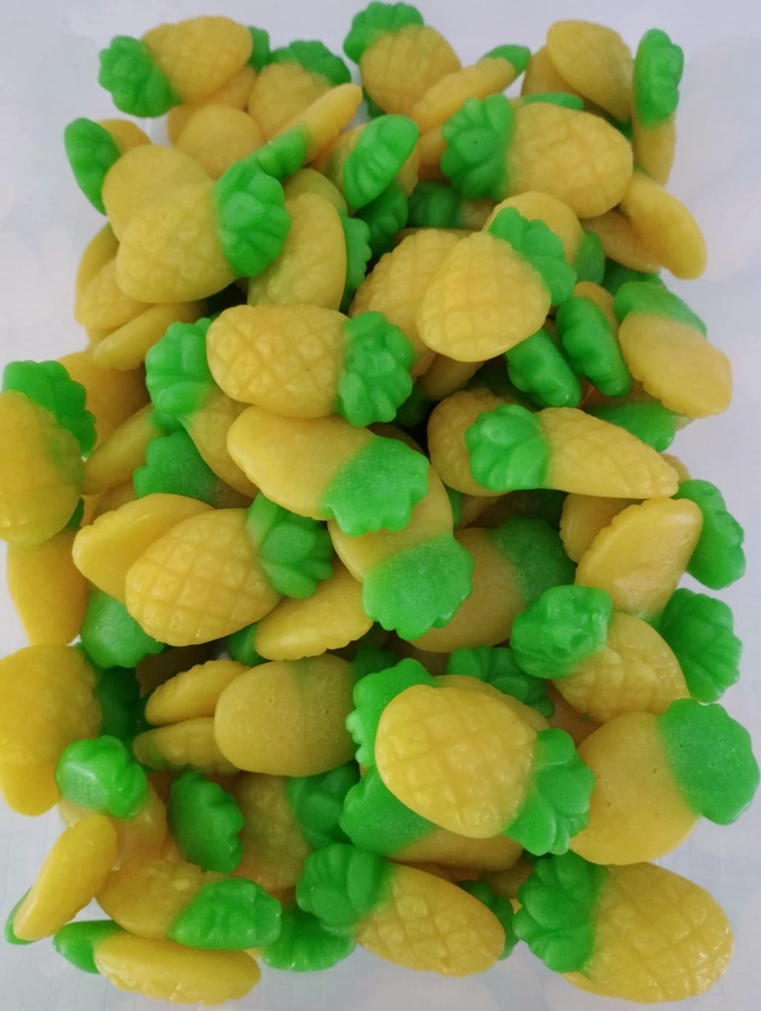 Ingrédients : Sirop de glucose, eau, sucre, amidon, gélatine de bœuf, acidifiant : acide citrique, régulateur d'acidité : citrate de sodium, agent d'enrobage : cire de caranuba, colorants : E100, E133.