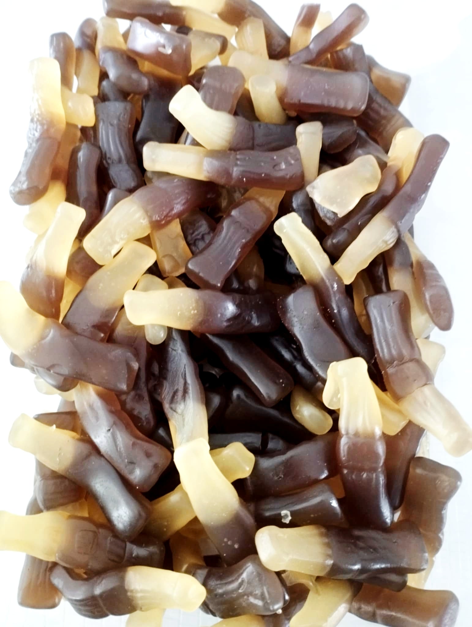 Sirop de glucose, sucre, eau, sucre, amidon, gélatine de boeuf, acidifiants : E330, arômes, régulateur d'acidité : E331, agent d'enrobage : cire de carnauba, colorants : E141ii, E163.