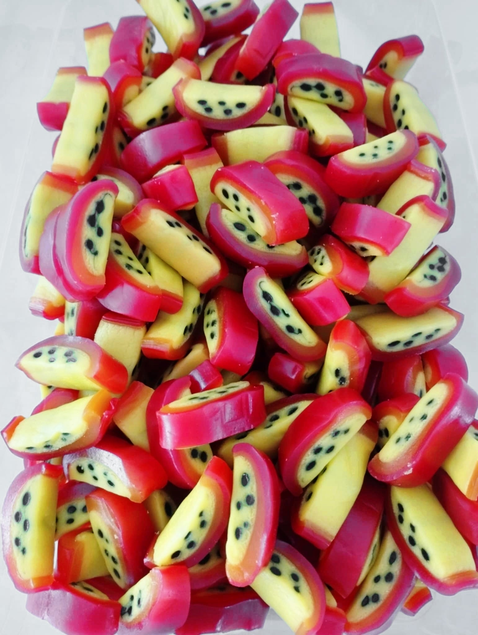 Ingrédients : Sucre, sirop de glucose-fructose, farine de blé (contenant gluten), 10% jus de pomme à base de concentré, amidon de maïs, humectant : glycérol ; graisse végétale de coco, sirop de sucre inversé; acidifiant : acide citrique ; fécule de pomme de terre, arômes; correcteur d'acidité : citrates de potassium ; huiles végétales (coco, colza), sel, émulsifiant : E471, colorants : E100, E120, E153. Allergènes : contient du GLUTEN.