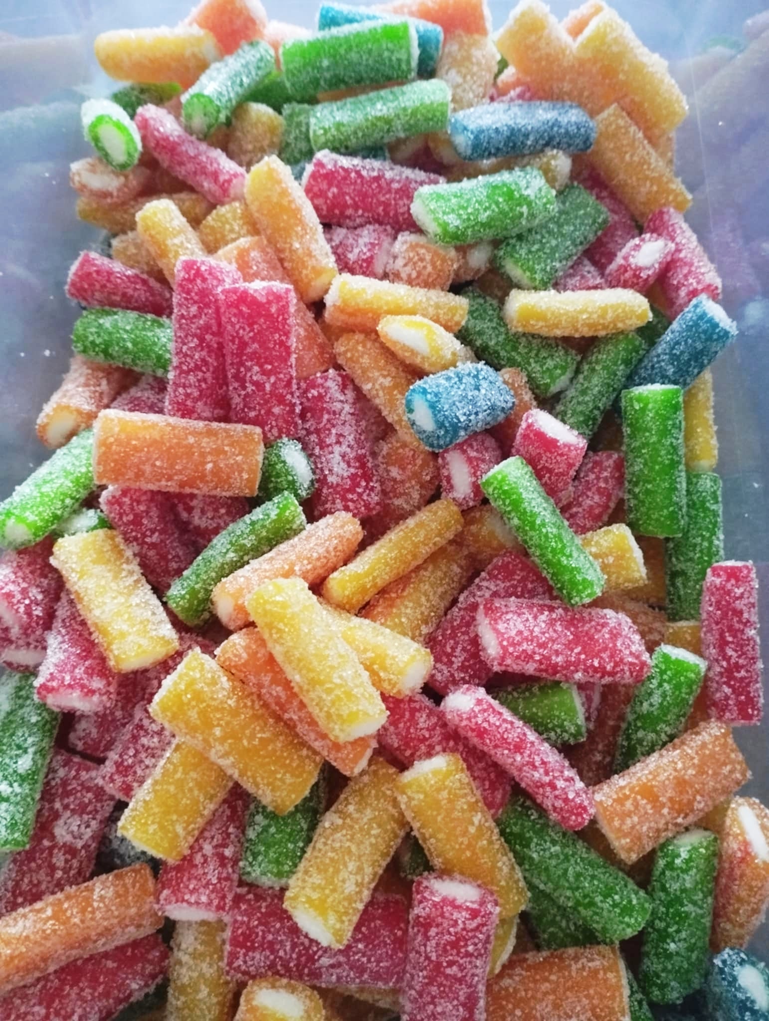 Ingrédients : Sucre, Sirop de glucose-fructose, farine de blé, amidon, acidifiants : E330, E296, huile et graisse végétale (palme), amidon modifié de pomme de terre, eau, humectants : E420(ii), E422, gélatine de bœuf, arômes, correcteur d'acidité E331(iii), émulsifiant E471, colorants : E100, E129, E133. Allergène : Conteneur du Gluten.