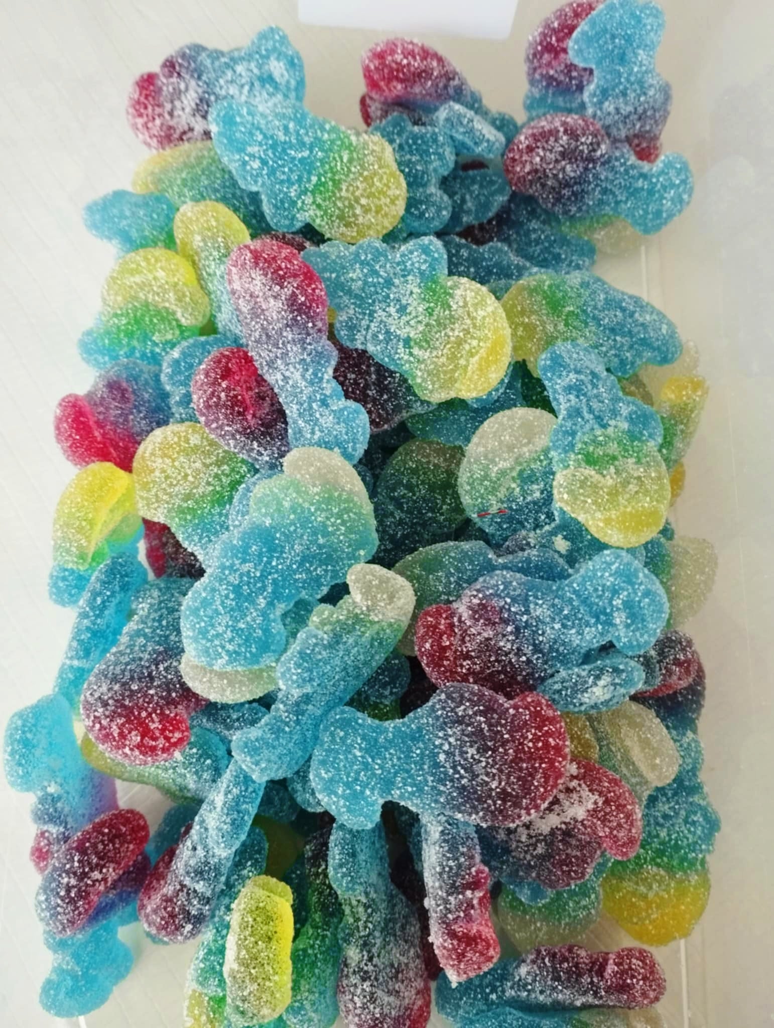 Ingrédients: sirop de glucose; sucre; gélatine; dextrose; acidifiants: acide citrique, acide malique; agent d'enrobage: cire de carnauba; correcteurs d'acidité: citrate tricalcique, malate acide de sodium; arôme; concentrés de fruits et de plantes: spiruline, carthame, citron, carotte. Tenir à l'abri de la chaleur et de l'humidité. Peut contenir des traces de blé, LAIT.