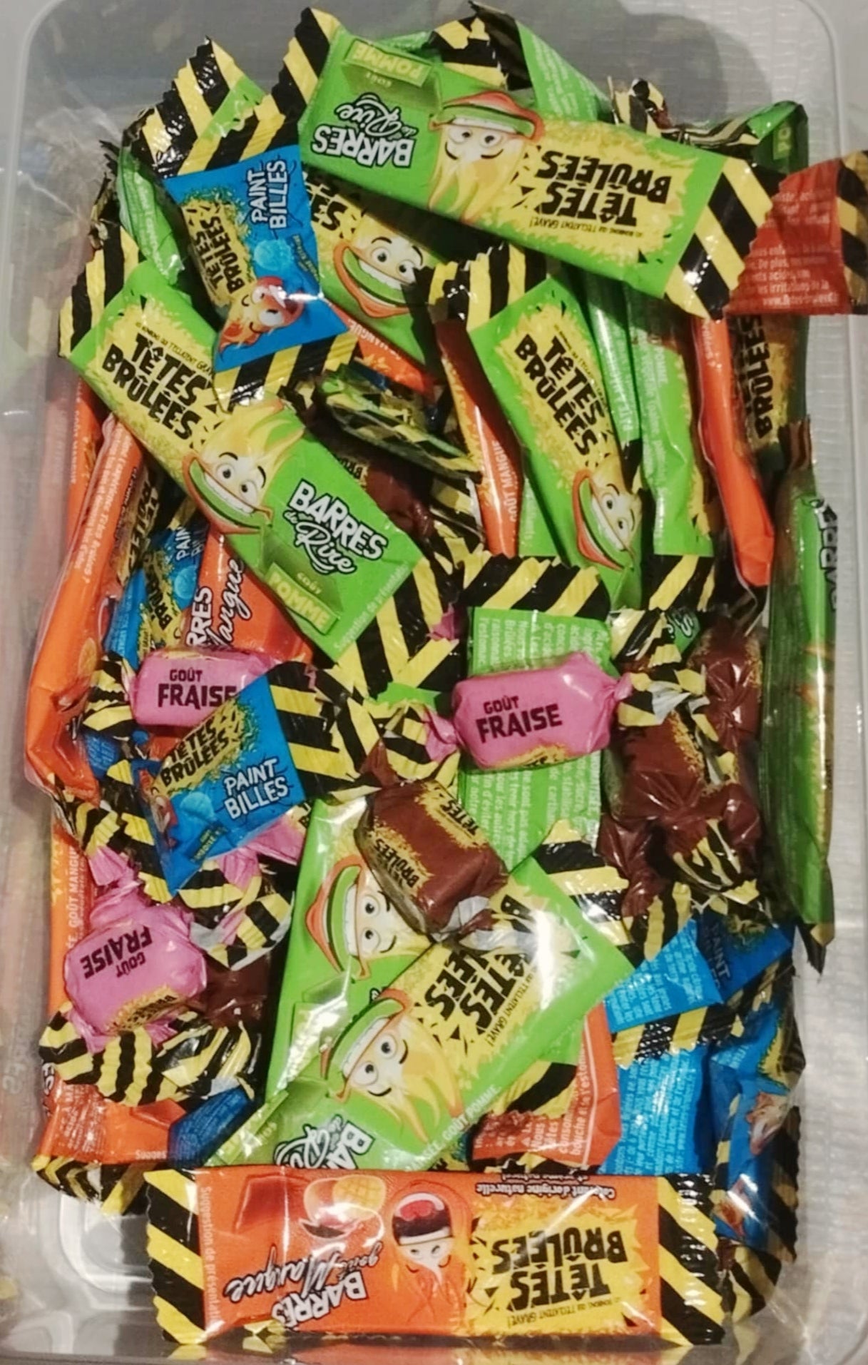 Vous pouvez déguster les billes acides aux goûts de framboise. Ainsi que nos barres gourmandes à la pomme et à la mangue et nos pâtes à mâcher acidulées aux goûts de cola ! Lot aléatoire de 100g
