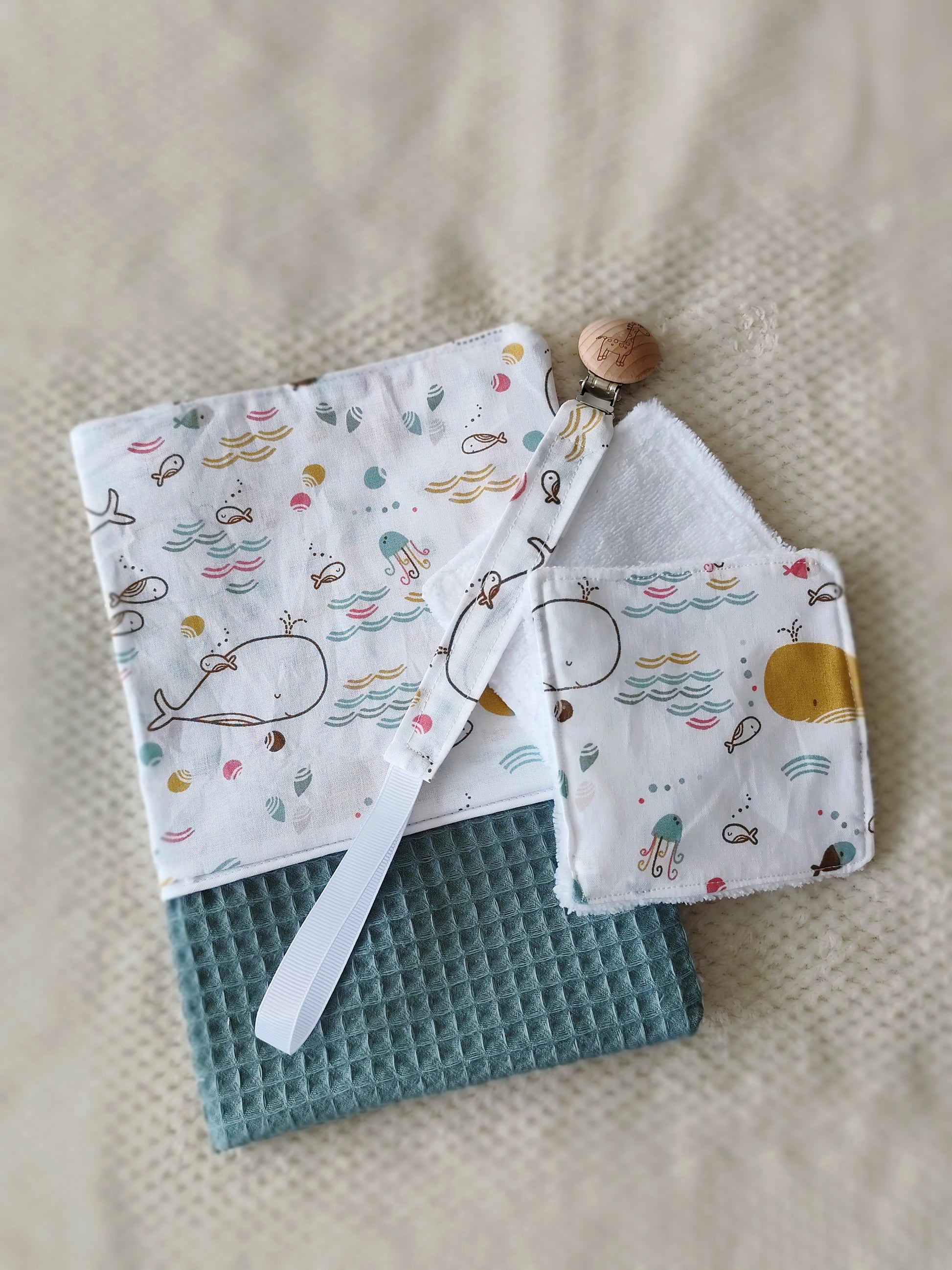 Dimensions : protège carnet standard, lingettes de 11cm/11cm, accroche tétine 24cm