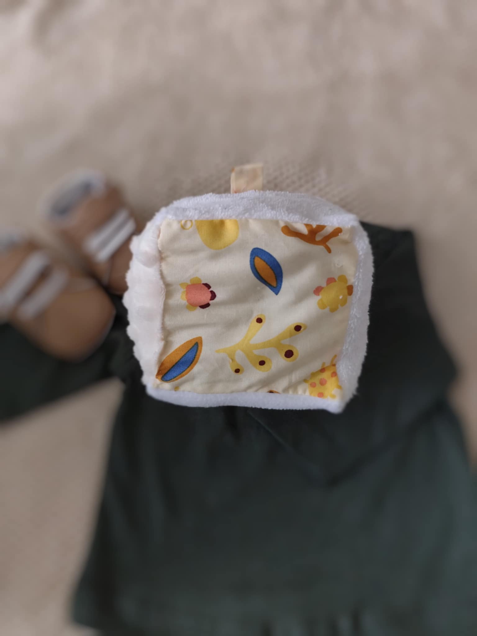 Le petit cube d’éveil fait partie des premiers jouets de bébé. Il lui permettra de développer ses différents sens grâce à ses différentes matières et couleurs (inspiration Montessori). Facile à attraper, le petit cube d’éveil permet de développer sa motricité et son toucher.