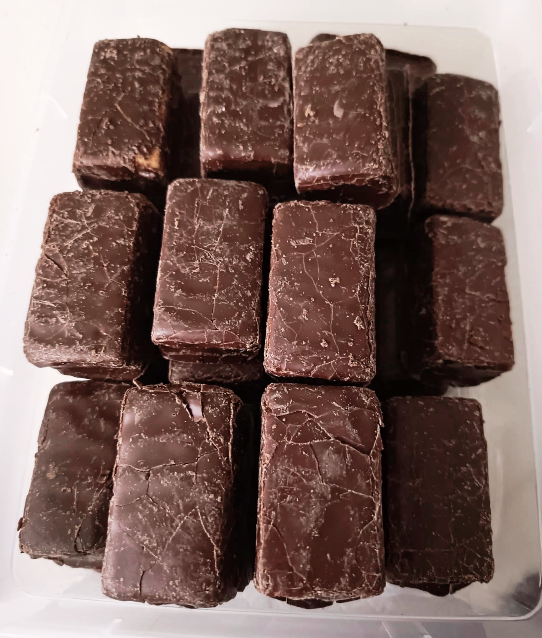 Ingrédients : sirop de glucose fructose, sucre, eau, beurre de cacao, poudre de lait entier, pâte de cacao, gélatine, lactosérum en poudre , émulsifiant : lécithine de tournesol, arômes.