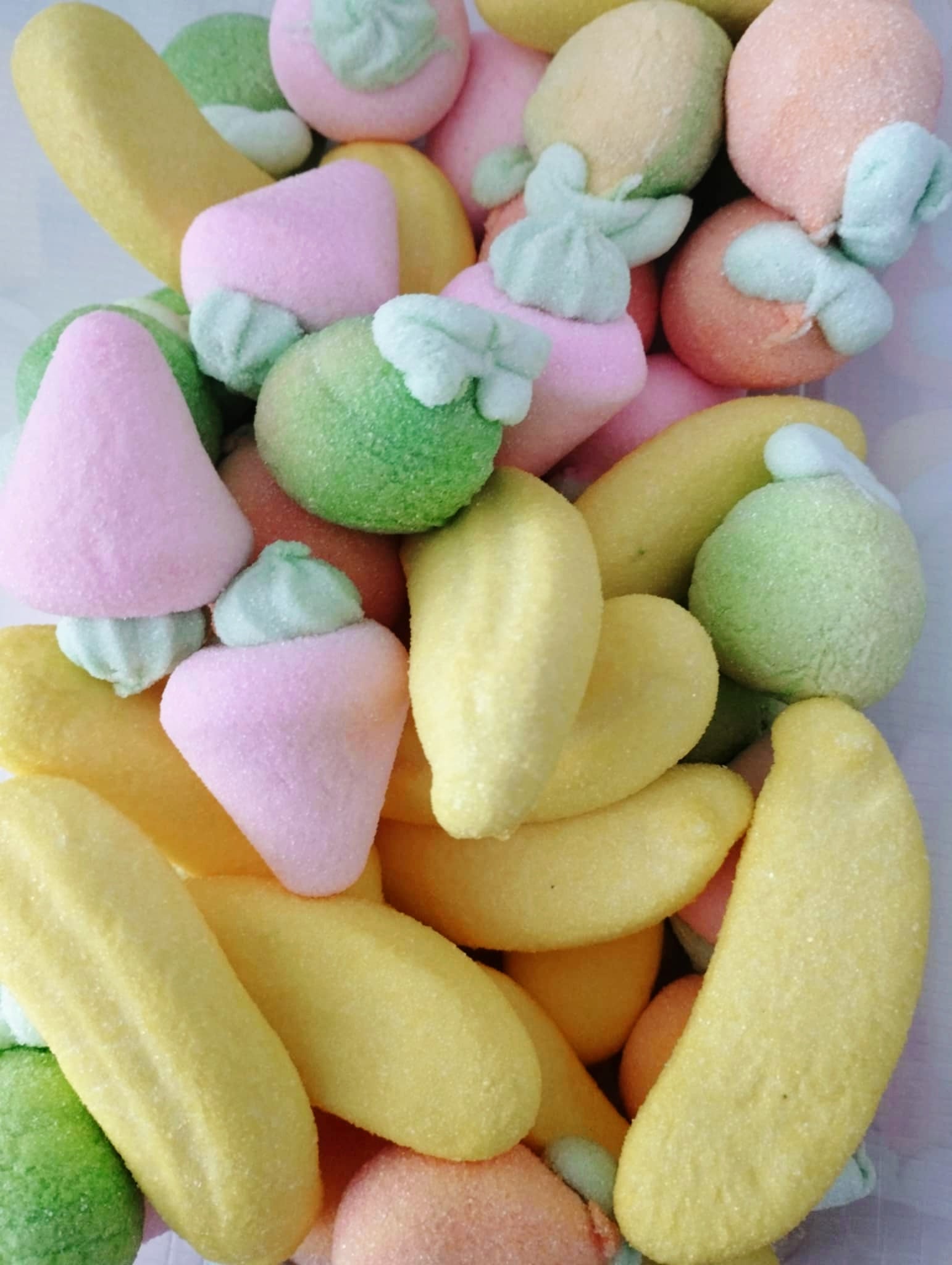 De moelleuses guimauves, qui renferment un fourrage semblable à celui des fruits qu'elles représentent et du chocolat. Ce sont des friandises amusantes, en forme de banane, pomme et fraise, que vous pourrez servir sur une table de bonbons ou lors de tout anniversaire que vous préparez.