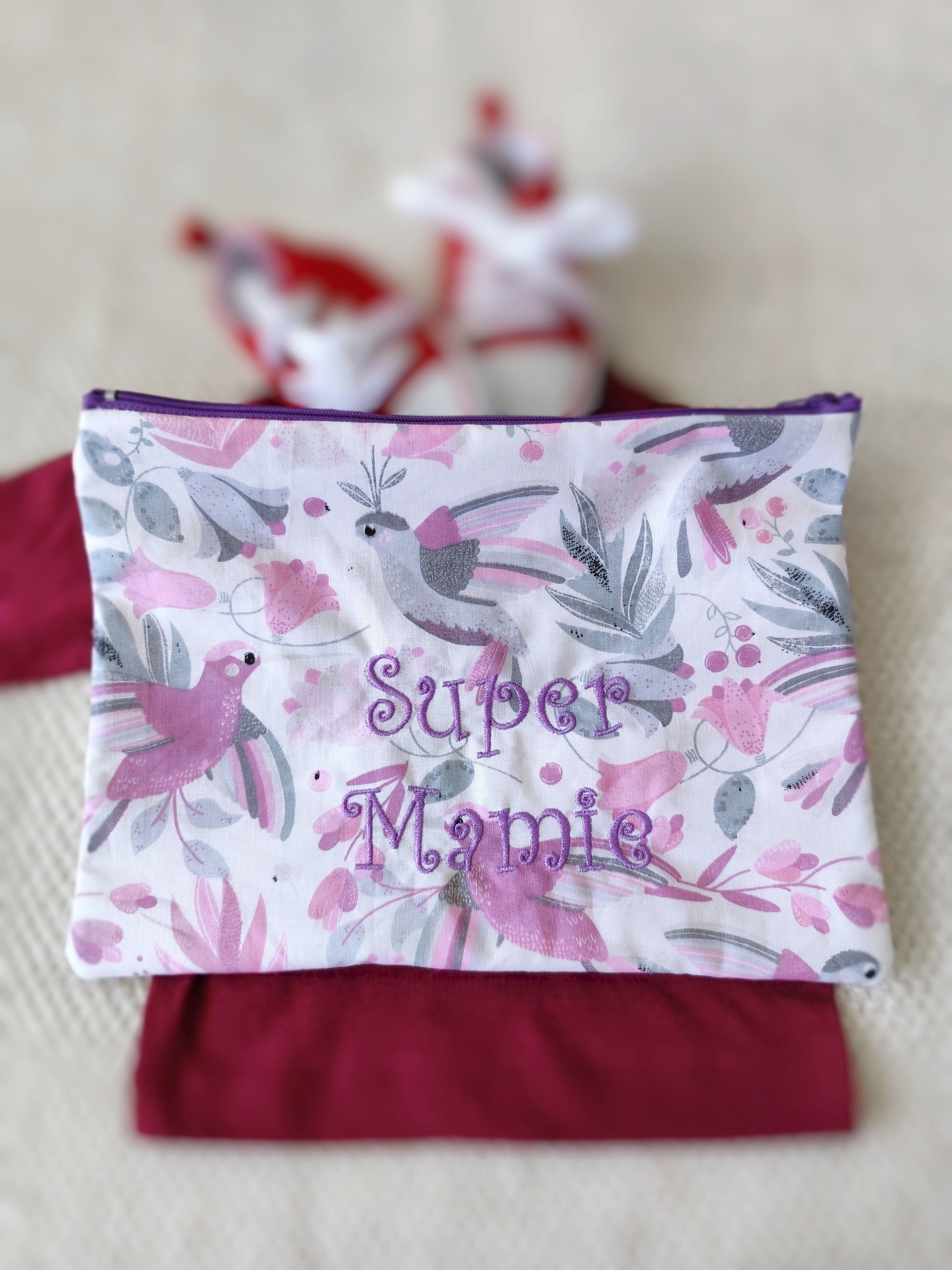 Magnifique trousse avec broderie à offrir ou pour annoncer une future naissance !!! Utile pour ranger tout pleins de choses à l'intérieur tout en étant unique.