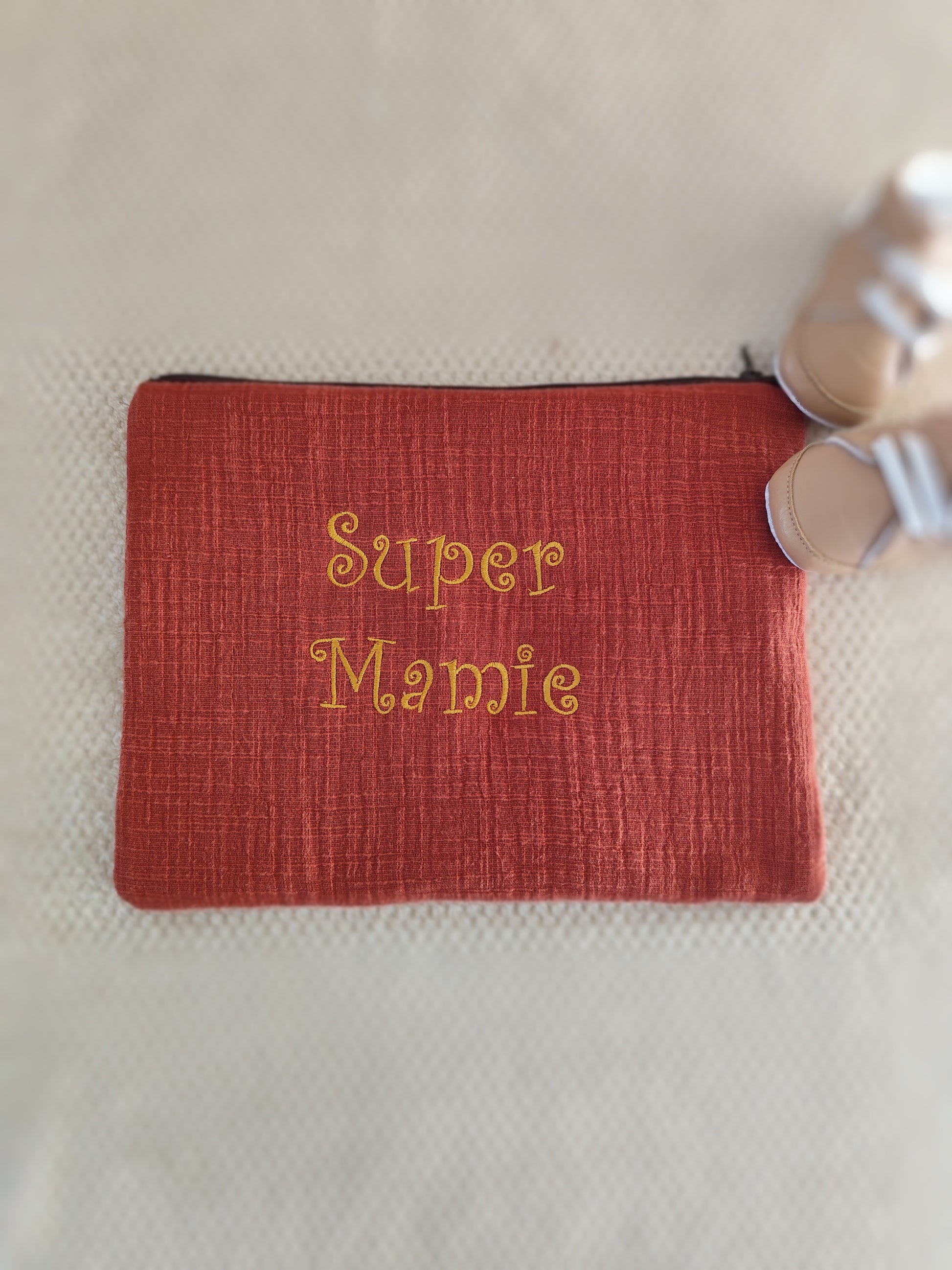Magnifique trousse avec broderie à offrir ou pour annoncer une future naissance !!! Utile pour ranger tout pleins de choses à l'intérieur tout en étant unique.